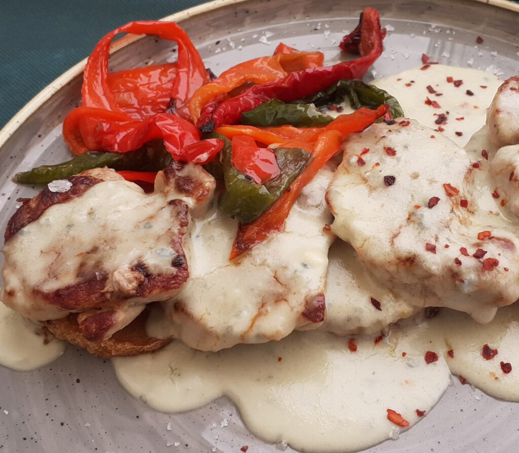 Versate in un tegame la panna e il latte. Unite il formaggio e fatelo sciogliere a fuoco medio. Servite i medaglioni di maiale ricoprendoli con la salsa al formaggio. Suggerisco di adagiarli su un letto di patate arrosto cucinate tradizionalmente ma preferibilmente tagliate a rondelle di circa 1 cm di altezza, e , volendo, accompagnate con peperoni arrostiti.
